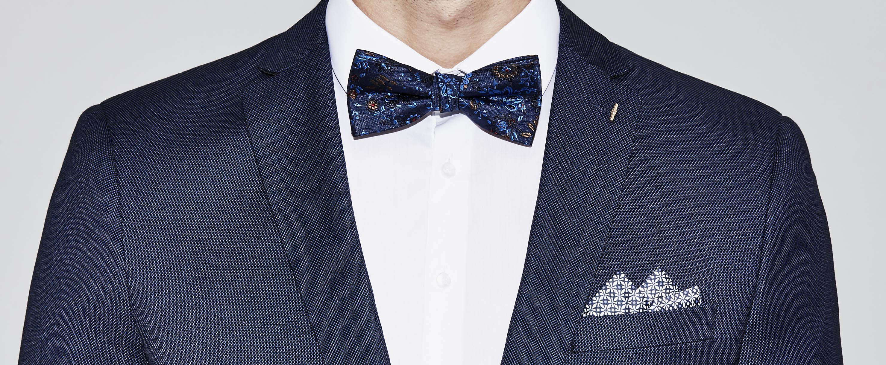 Use a floral or striped bow tie to add punch to a classic navy suit and crisp white shirt. Or if you want to dip your toes into the water first, simply take your suit colour and match it to a similar coloured bow tie.